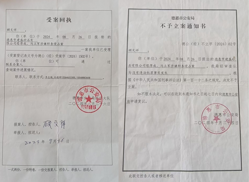 更令人震惊的是,公司账目混乱不堪,多笔款项去向不明。股东们在2023年股东大会对账时发现,冯立军以“给运管送礼”为由支取的16.703万元,既无明确收款对象,也无有效凭证;冯立军、塔厚成声称用于“还债”的12万立方米中砂,同样无法说明债务对象,对应的270万元现金也凭空消失。此外,2023年对账还查出冯立军以“打点有关部门”为名侵吞的90.0382万元,依旧是一笔“糊涂账”。不仅让如此,冯立军等人还将26名股东共同垫起来的9万多平米的储存场地占为己有,本来属于股东共有的财产股东们可以免费使用,而现在却必须给他们缴费。 除了侵占公司现有资产,冯立军团伙还把手伸向了非法盗采。2021-2024年,冯立军的弟弟冯立志(刑满释放人员)、妻子马大艳及刘雪芳(外号刘小六),用“坐地抽”设备盗采中砂80万立方米;2021年9月,塔厚成指使其儿子塔兴银盗采砂石6800立方米,价值60多万元,有录音为证。2024年11月25日至12月5日,冯立军、金士申与冯立志等(涉黑涉恶人员)又联手盗采2万立方米中砂。更有录音证据显示,刘雪芳作为非公司人员,以“白手套”身份参与盗采,相关痕迹虽被刻意销毁,却仍有未处理的账目记录留存。 公职人员涉嫌护航:“砂霸”背后的保护伞阴影 举报材料中,多名德惠市公职人员被指与冯立军团伙存在利益勾结,为其非法行为提供“保护”。其中:德惠市公安局党办书记张某被指指使妹夫拉走13-14万立方米中砂,造成公司240万元损失;市公安局食药环侦查大队大队长金某拉走2万立方米中砂,按当时60元/立方米的价格计算,价值120万元;市水利局矿石管理所副所长刘某、所长张某,分别通过冯立军以砂石换取德惠市盛世豪庭的1套和2套房产;市运输管理所乡道所所长朱某则以“不让公司拉砂”相要挟,强行低价拉走2万多立方米砂石,至今仍有1493立方米未付款。 这些涉嫌充当“保护伞”的公职人员,让冯立军团伙的非法行为愈发肆无忌惮。股东们曾多次向当地警方反映情况,却迟迟未等来有效处理,“砂霸”的嚣张气焰和背后的权力网络,成了压在26名股东心头的巨石。 据股东们提供的证据,股东之一的顾文祥曾经于2024年8月26日,以冯立军、塔厚成涉嫌职务侵占罪向德惠市公安局报案,该局于当日出具了《受案回执》,但是同年10月24日又出具了《不予立案通知书》,理由是:“我局经审查认为没有犯罪事实发生”。 异地办案破冰:抓捕归案后举报人的担忧仍在 在当地举报无果后,股东们并未放弃,他们将整理好的证据材料递至长春市公安局。在长春市公安局的统筹部署下,这起案件启动异地办案机制,指定榆树市公安局负责侦办。得益于异地办案带来的独立性,办案阻力大幅减少,冯立军、塔厚成、金士申等主要涉案人员先后于2025年6月因涉嫌非法采矿罪等罪名被榆树公安刑事拘留。