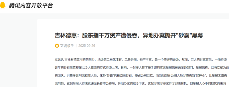 更令人震惊的是,公司账目混乱不堪,多笔款项去向不明。股东们在2023年股东大会对账时发现,冯立军以“给运管送礼”为由支取的16.703万元,既无明确收款对象,也无有效凭证;冯立军、塔厚成声称用于“还债”的12万立方米中砂,同样无法说明债务对象,对应的270万元现金也凭空消失。此外,2023年对账还查出冯立军以“打点有关部门”为名侵吞的90.0382万元,依旧是一笔“糊涂账”。不仅让如此,冯立军等人还将26名股东共同垫起来的9万多平米的储存场地占为己有,本来属于股东共有的财产股东们可以免费使用,而现在却必须给他们缴费。 除了侵占公司现有资产,冯立军团伙还把手伸向了非法盗采。2021-2024年,冯立军的弟弟冯立志(刑满释放人员)、妻子马大艳及刘雪芳(外号刘小六),用“坐地抽”设备盗采中砂80万立方米;2021年9月,塔厚成指使其儿子塔兴银盗采砂石6800立方米,价值60多万元,有录音为证。2024年11月25日至12月5日,冯立军、金士申与冯立志等(涉黑涉恶人员)又联手盗采2万立方米中砂。更有录音证据显示,刘雪芳作为非公司人员,以“白手套”身份参与盗采,相关痕迹虽被刻意销毁,却仍有未处理的账目记录留存。 公职人员涉嫌护航:“砂霸”背后的保护伞阴影 举报材料中,多名德惠市公职人员被指与冯立军团伙存在利益勾结,为其非法行为提供“保护”。其中:德惠市公安局党办书记张某被指指使妹夫拉走13-14万立方米中砂,造成公司240万元损失;市公安局食药环侦查大队大队长金某拉走2万立方米中砂,按当时60元/立方米的价格计算,价值120万元;市水利局矿石管理所副所长刘某、所长张某,分别通过冯立军以砂石换取德惠市盛世豪庭的1套和2套房产;市运输管理所乡道所所长朱某则以“不让公司拉砂”相要挟,强行低价拉走2万多立方米砂石,至今仍有1493立方米未付款。 这些涉嫌充当“保护伞”的公职人员,让冯立军团伙的非法行为愈发肆无忌惮。股东们曾多次向当地警方反映情况,却迟迟未等来有效处理,“砂霸”的嚣张气焰和背后的权力网络,成了压在26名股东心头的巨石。 据股东们提供的证据,股东之一的顾文祥曾经于2024年8月26日,以冯立军、塔厚成涉嫌职务侵占罪向德惠市公安局报案,该局于当日出具了《受案回执》,但是同年10月24日又出具了《不予立案通知书》,理由是:“我局经审查认为没有犯罪事实发生”。 异地办案破冰:抓捕归案后举报人的担忧仍在 在当地举报无果后,股东们并未放弃,他们将整理好的证据材料递至长春市公安局。在长春市公安局的统筹部署下,这起案件启动异地办案机制,指定榆树市公安局负责侦办。得益于异地办案带来的独立性,办案阻力大幅减少,冯立军、塔厚成、金士申等主要涉案人员先后于2025年6月因涉嫌非法采矿罪等罪名被榆树公安刑事拘留。