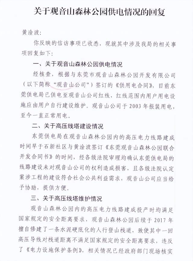 公园相关负责人无奈的说,我们多年来无数次的写反映信、打举报电话,召开专家论证会,借助媒体曝光,委托律师起诉,到国务院督查办、广东省信访平台反映,只要大家想的到的,我们都做了,可是收效甚微。比如,公园方到国务院督查办或广东省信访平台写举报信,上面了解情况后,直接转到归属地(也就是当地)受理,而当地领导干部官官相护,我们举报当地某领导的举报信,又回到了当地某领导手里。你说搞笑不搞笑。这种“传声筒”式的处理方式,既没有对问题进行分析,也没有提出处置方案,更没有对下监督跟进,这不就是一种懒政怠政行为吗?那国家开通这种“互联网+督察”平台的意义在哪里? 要知道,公园方反映的问题可都是“顽瘴痼疾”,就是因为当地不想或处理不了,积累数十年无奈之下才向上反映的,结果上面又给转到归属地(当地)处理。 那么事件发生了这么久,为什么相关部门可以无动于衷?为什么没有人去帮助解决民营企业碰到的实际困难? 为什么主管部门都是一副事不关己高高挂起的冷漠模样?东莞这样的营商环境,企业能不倒闭吗?老板能不跑路吗? 暂且抛开南方电网在观音山上违建高压线塔的事件不谈,就单纯的说供电的事:一个民营企业,要求供电部门义务供电,从1999年至今的22年时间里,甚至连一个最基本的“村村通”的用电问题都没有得到有效解决!公园80%面积没有电力供应,都是公园自发用柴油发电机解决。 请问,给民企供个电,怎么就这么难了? 2020年12月22日央视《谈事说理》栏目播出专题"《谈事说理》之搁浅的公园"其中就着重谈到观音山国家森林公园悬而未决的基本供电问题。 在专题节目中,北京林业大学教授杨朝霞发表观点:我们说二十几年来,他80%的电是他自己发电的,就是东莞市供电公司不给。这个来说是违法的。因为我们的《电力法》是明确规定的,就是电力公司、电力的供电机构是有给用户供电的强制的义务的。你不能拒绝供电,如果是拒绝供电,那么就是违法,就是你的强制义务。